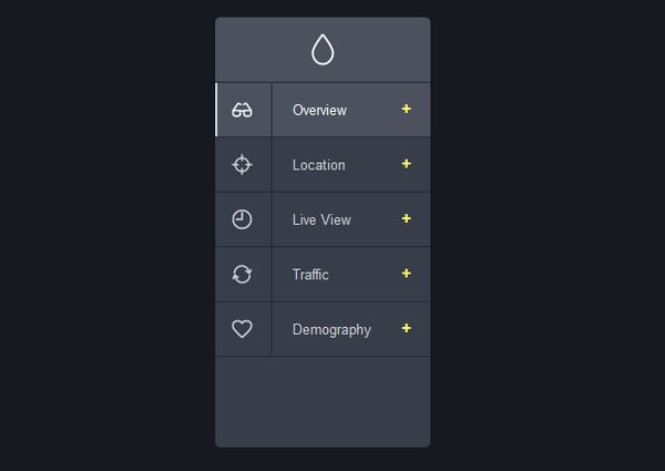 This sleek dark navigation menu was created with a dashboard’s functionality in mind. Initially, it is presented as a small button that morphs into a relatively wide panel, though occupying not so much space thanks to its well-organized stripe style layout; this a great alternative for compact and minimal designs.