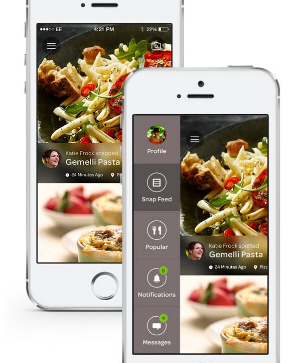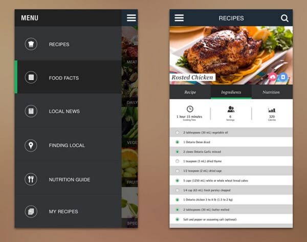 The app is dedicated to food industry, so it’s not surprising that almost every screen is based on a mouth-watering photo background. However, heavily blurred and solid color backdrops that are used for option panels and side menus don’t detract from readability.
